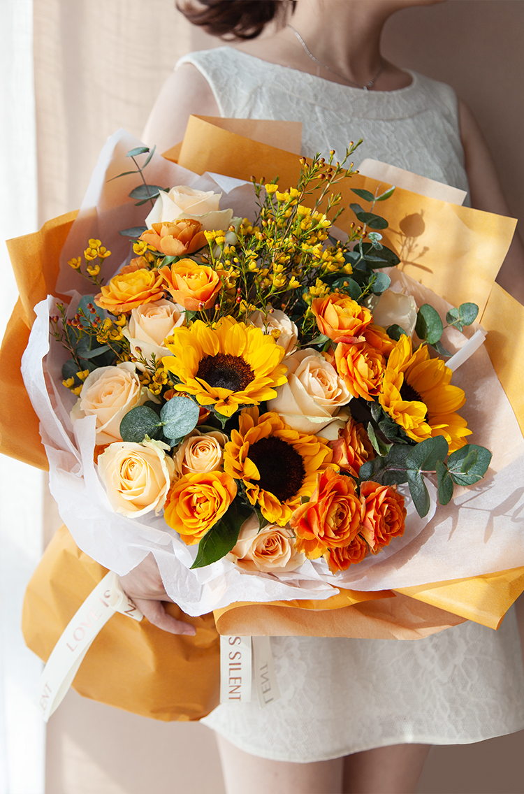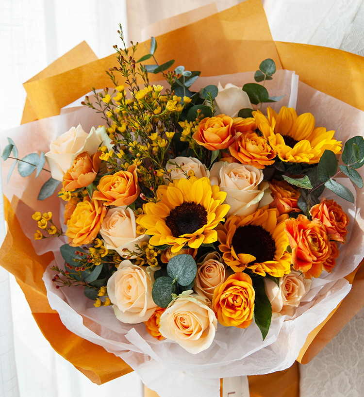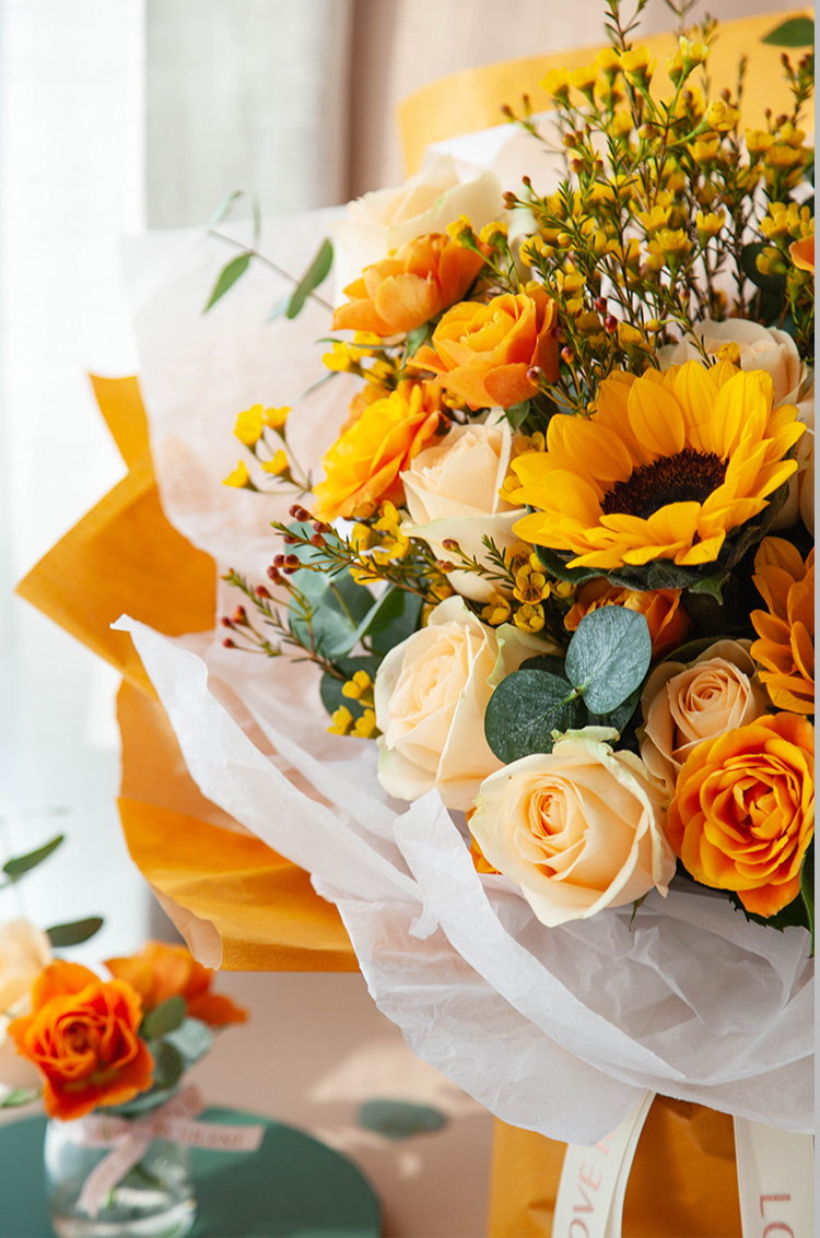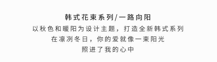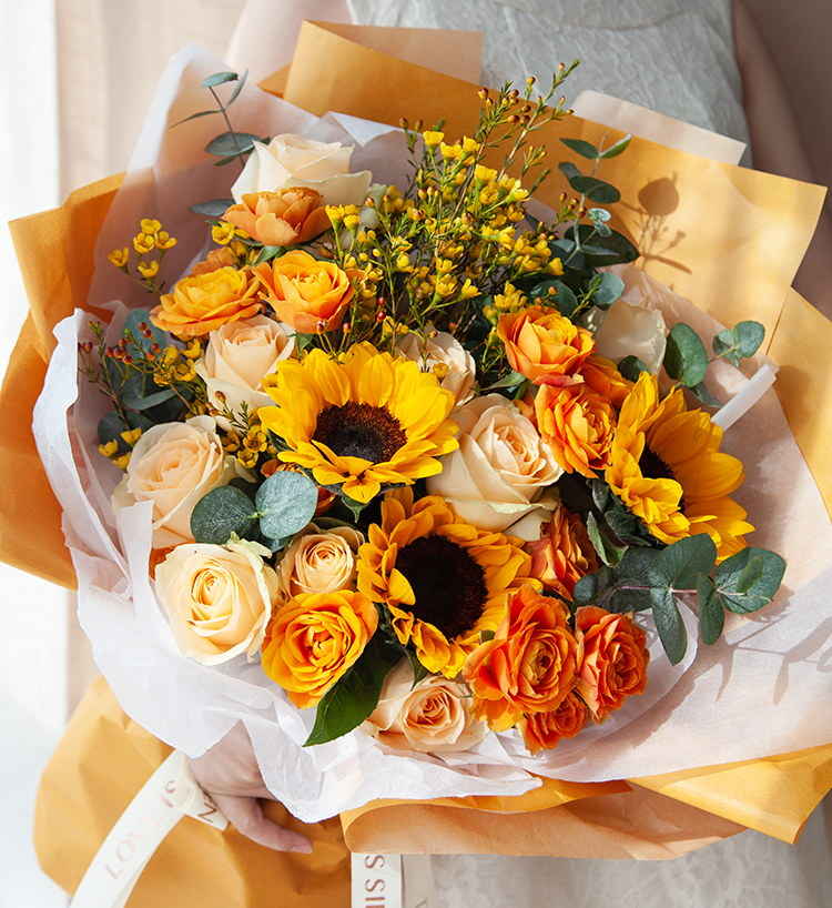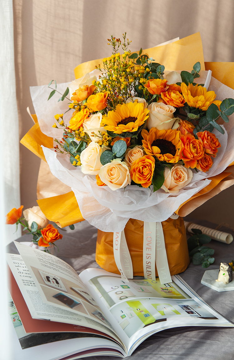 一路向阳-韩式花束系列:向日葵3枝、香槟玫瑰9枝、橙色多头玫...