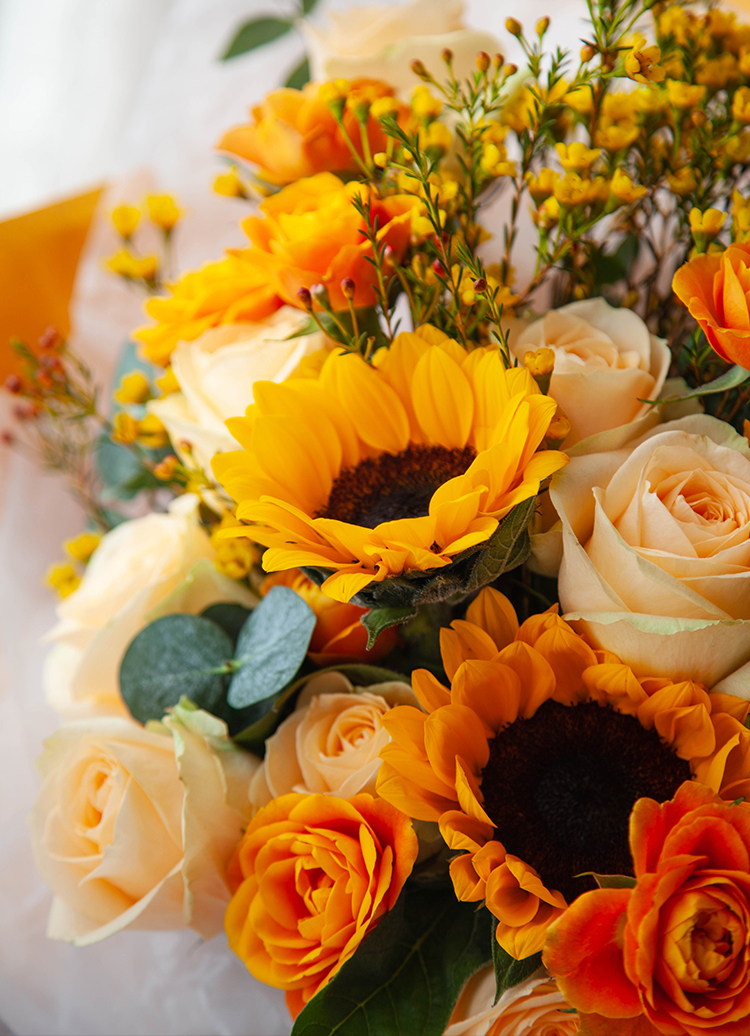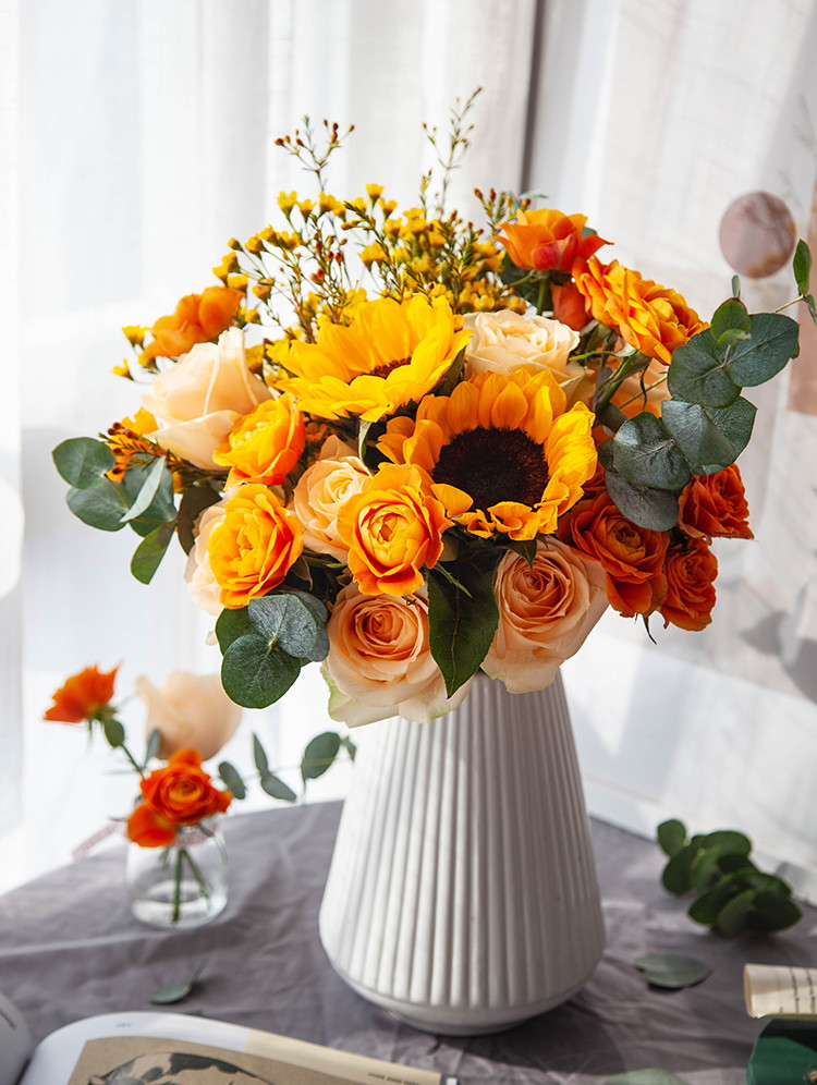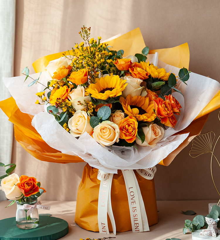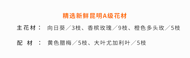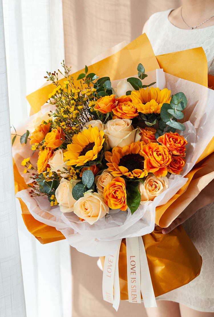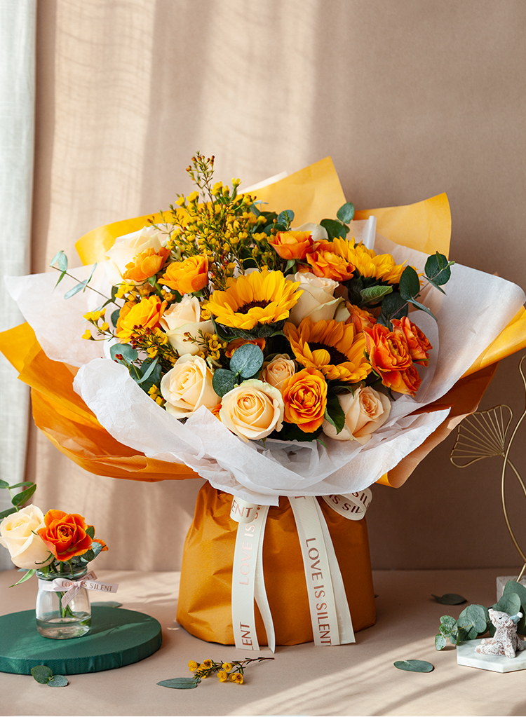一路向阳-韩式花束系列:向日葵3枝、香槟玫瑰9枝、橙色多头玫...