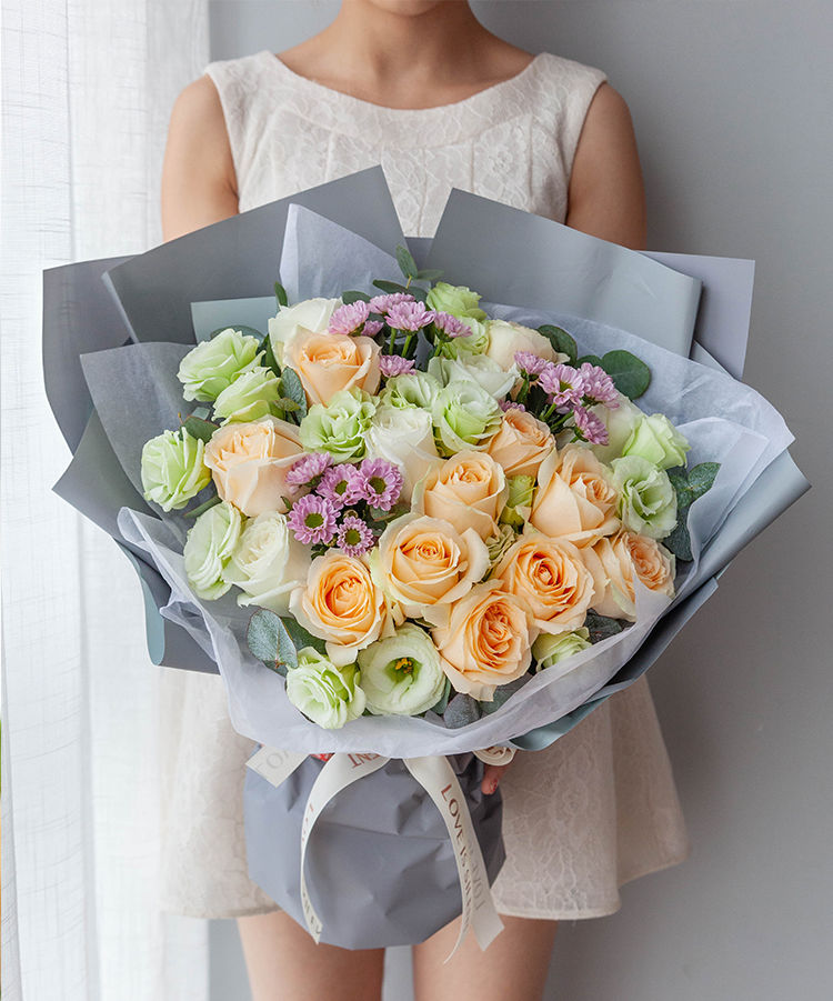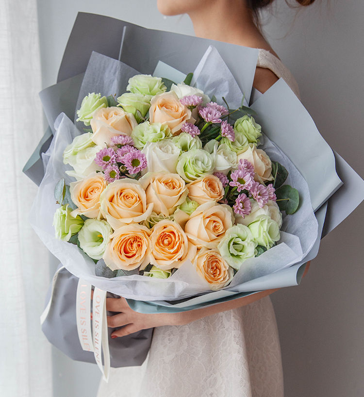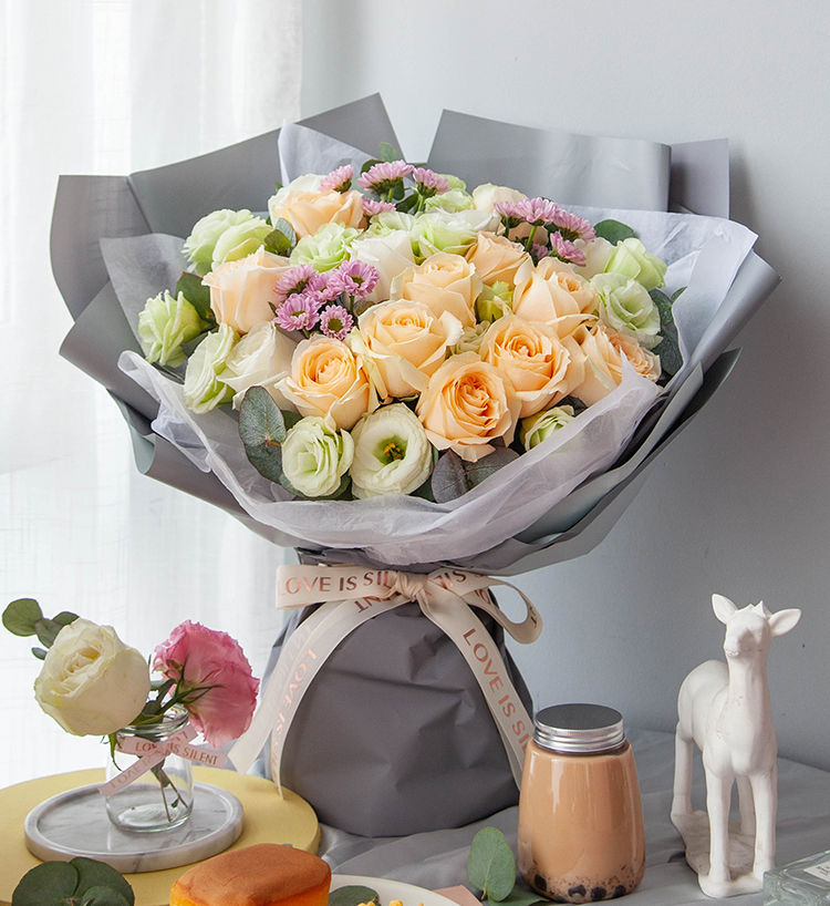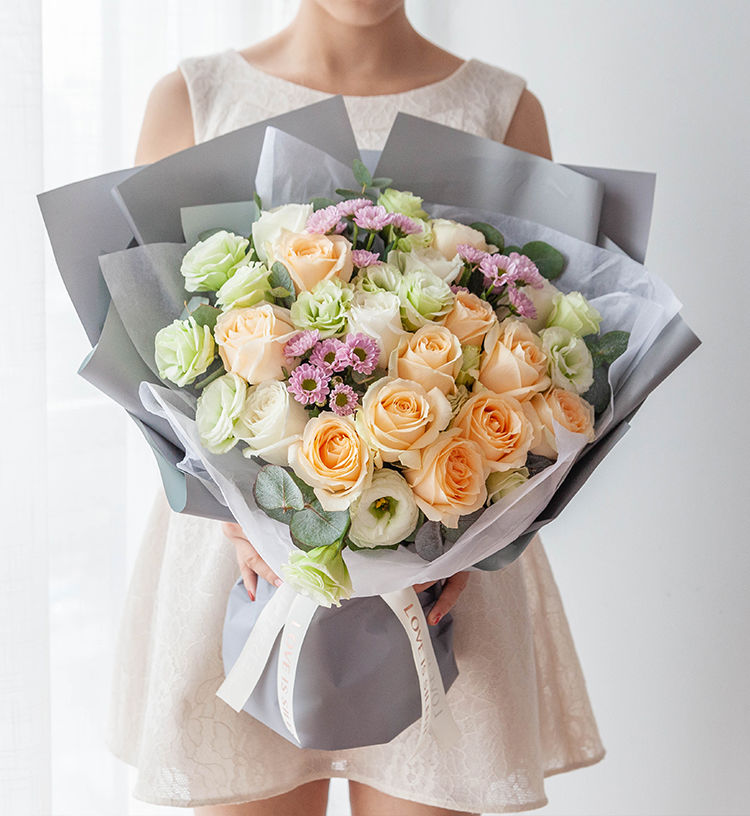 包 装:灰/白色欧雅纸7张、白色雪梨纸2张、浅粉色罗纹玫瑰金丝带1.5米