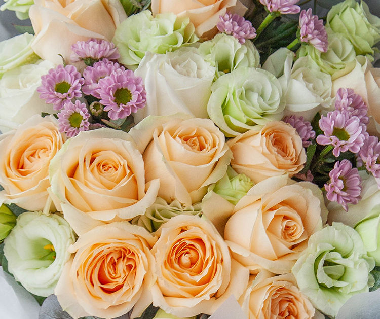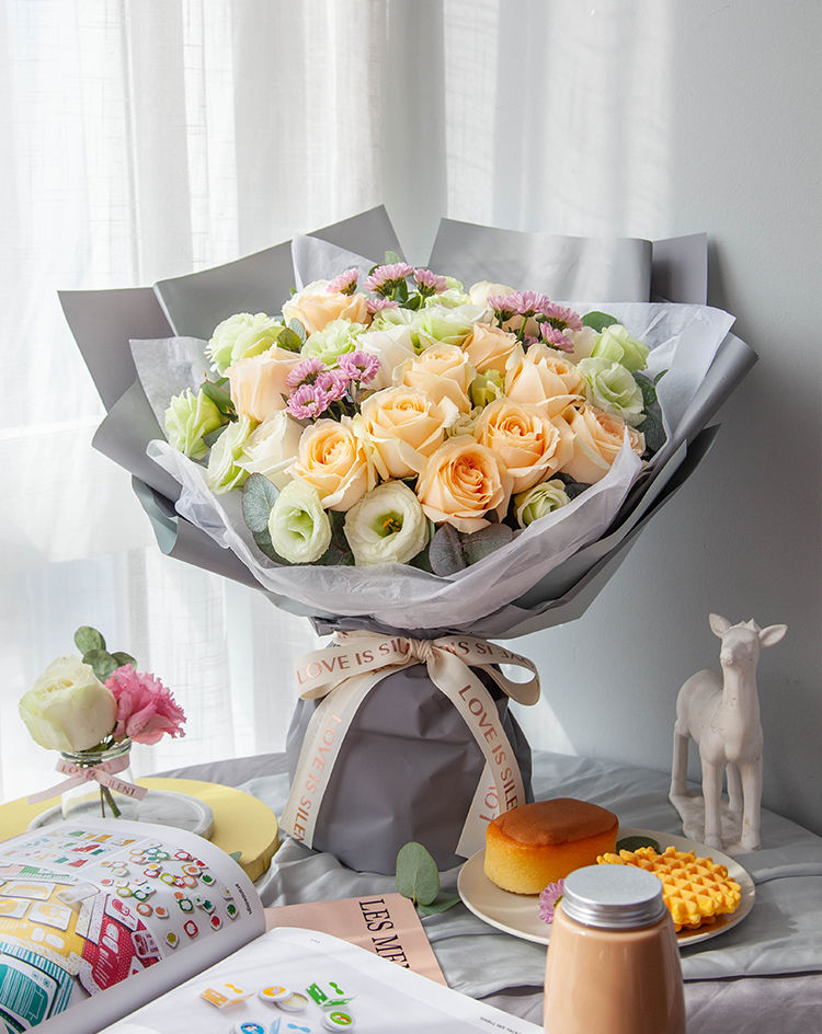 一路向阳-韩式花束系列:向日葵3枝、香槟玫瑰9枝、橙色多头玫...