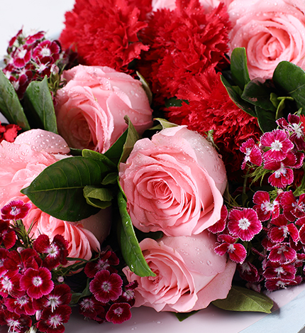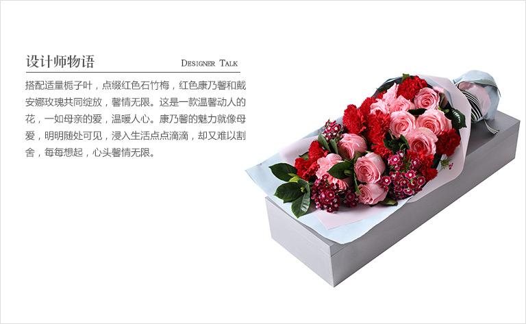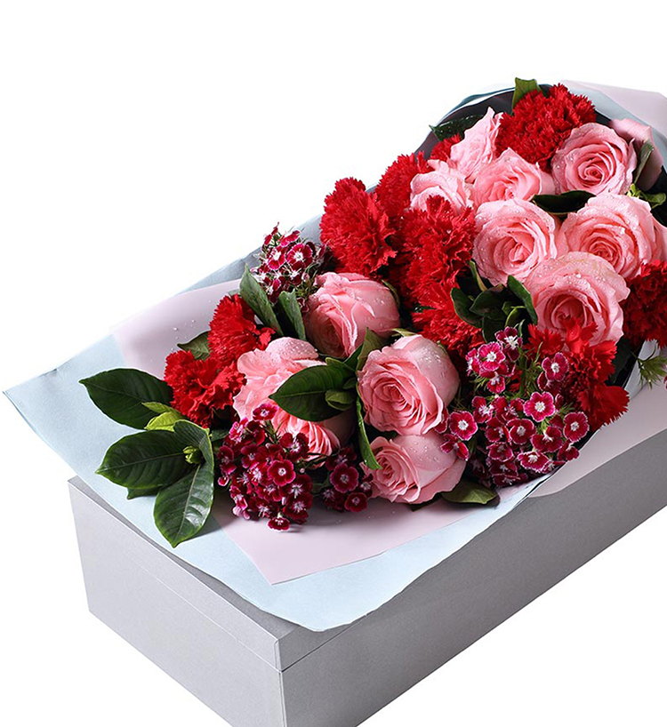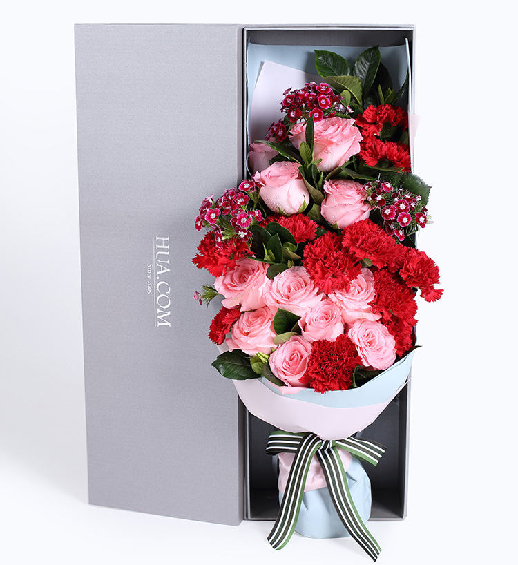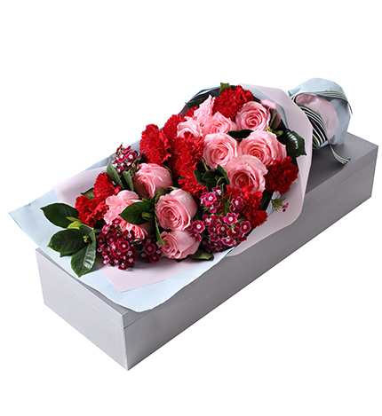 红色康乃馨11枝,粉色勿忘我3枝、尤加利10枝