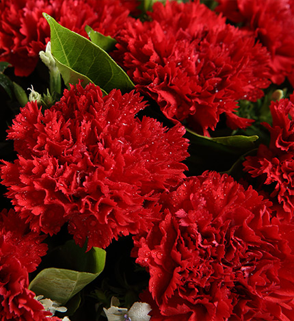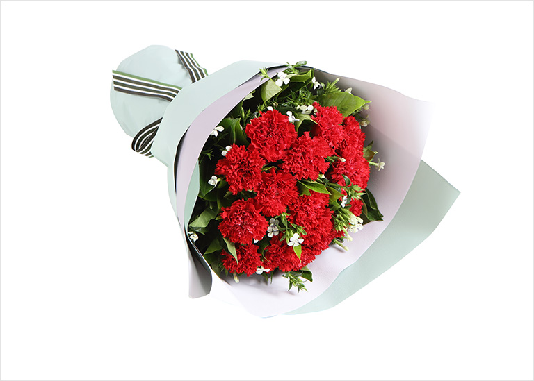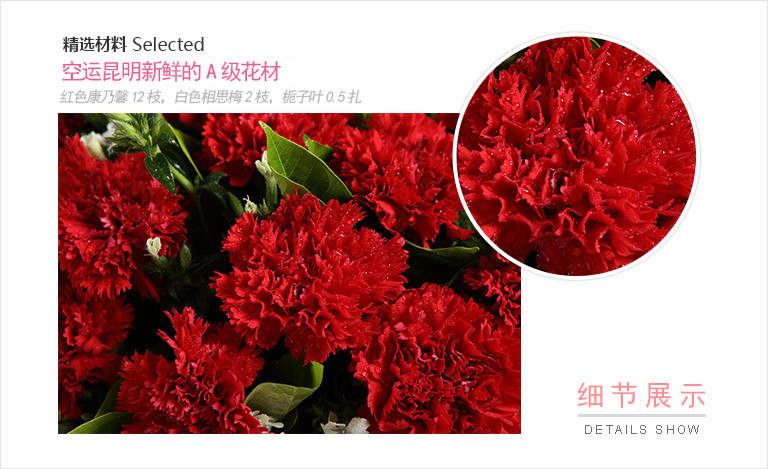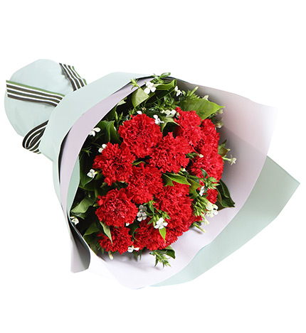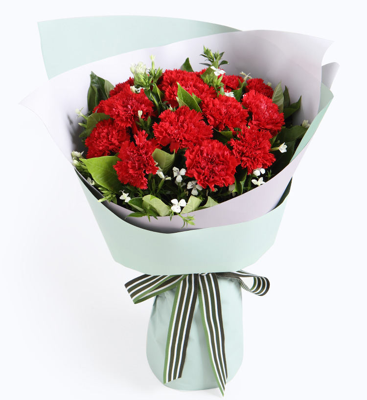 红色康乃馨11枝,粉色勿忘我3枝、尤加利10枝