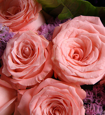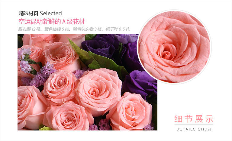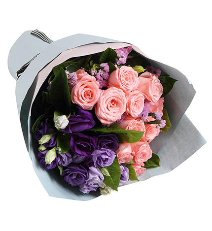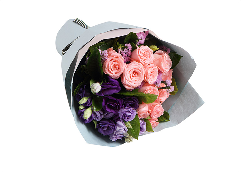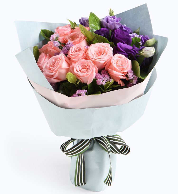 包装:粉色opp雾面纸,蓝灰色绝色纸,白绿罗纹带
