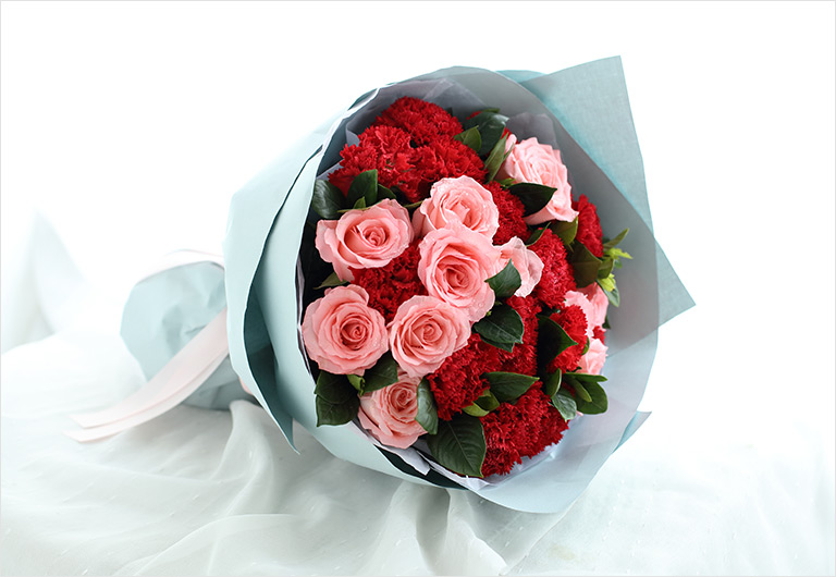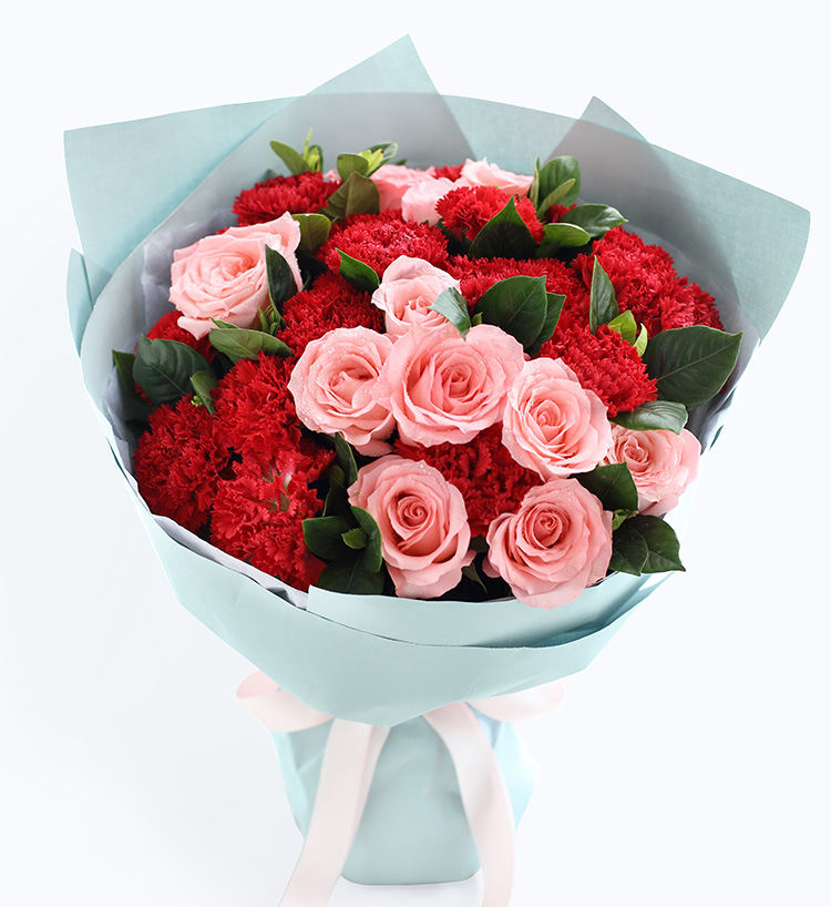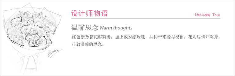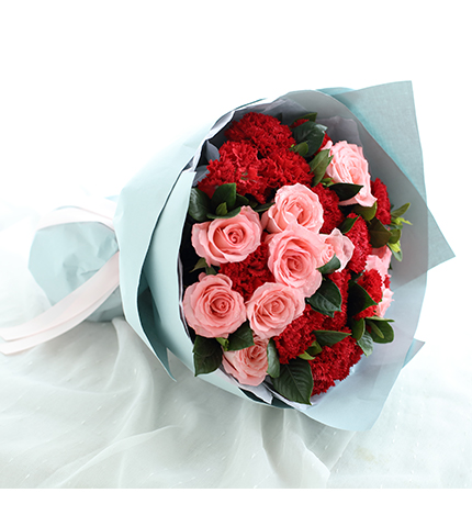 红色康乃馨11枝,粉色勿忘我3枝、尤加利10枝