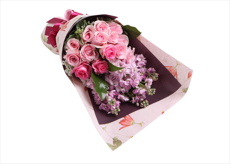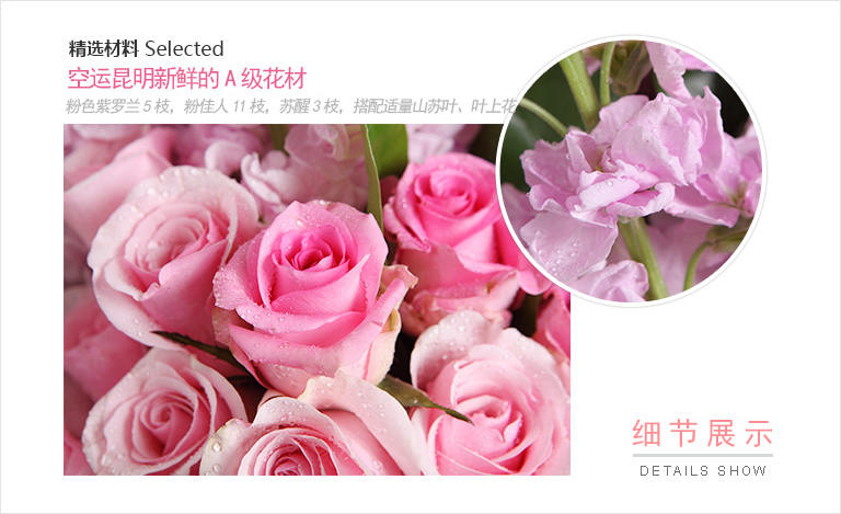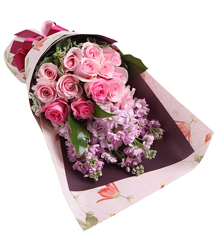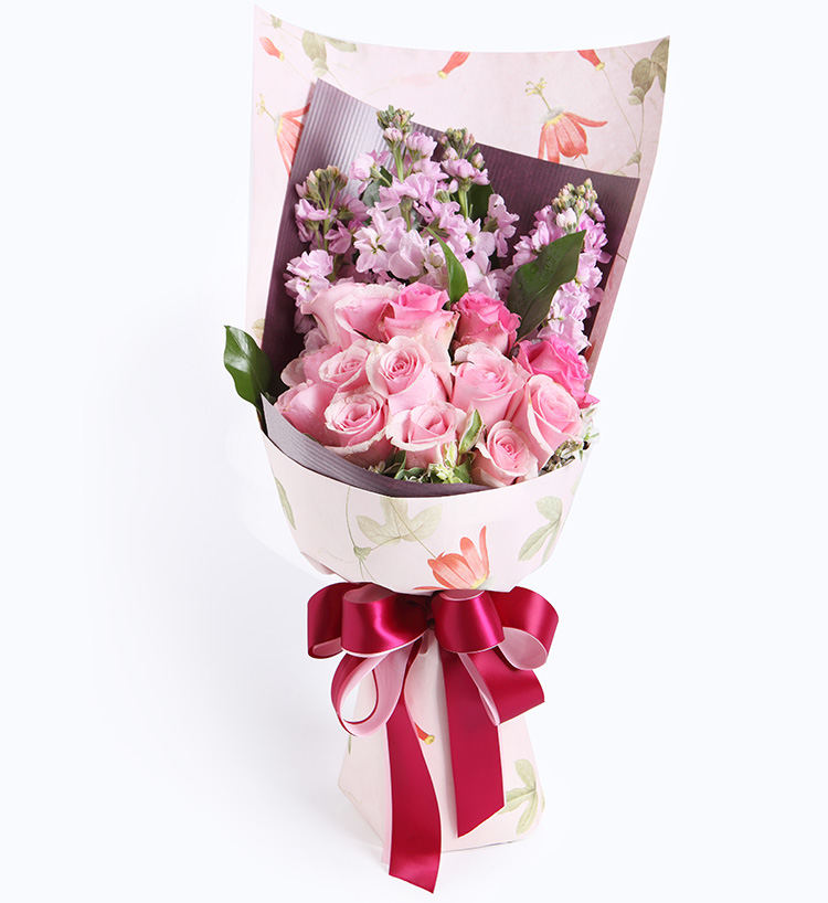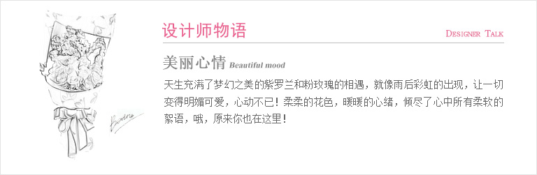 包 装:吊花压纹纸,紫红色牛油纸,红粉双色缎带花结