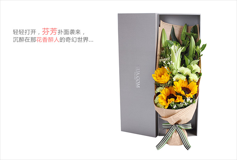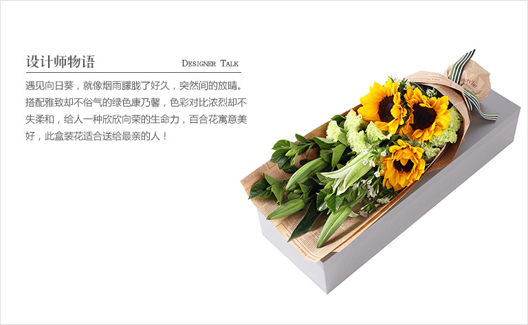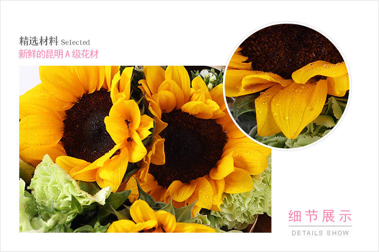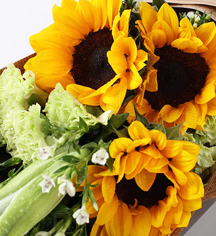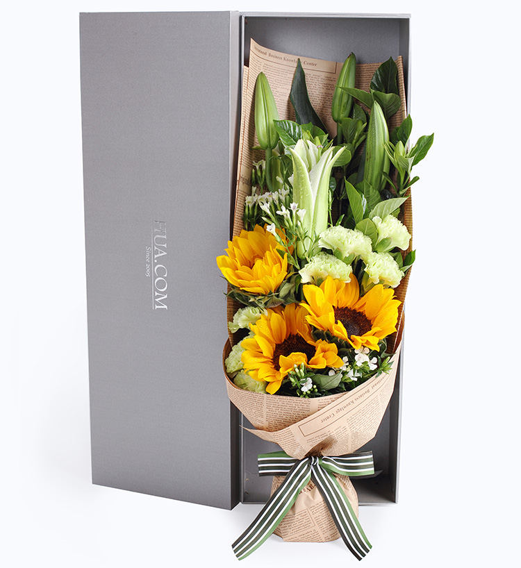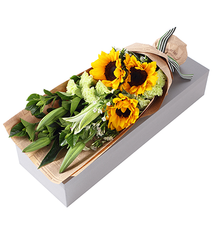 一路向阳-韩式花束系列:向日葵3枝、香槟玫瑰9枝、橙色多头玫...