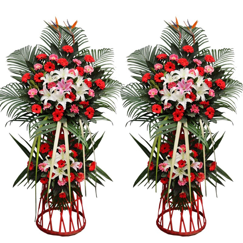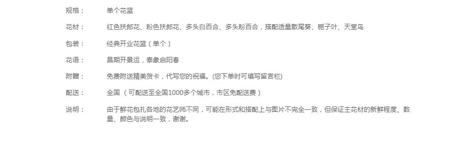 花材:红色扶郎花、粉色扶郎花、多头白百合、多头粉百合,搭配适量散尾葵、栀子叶、天堂鸟