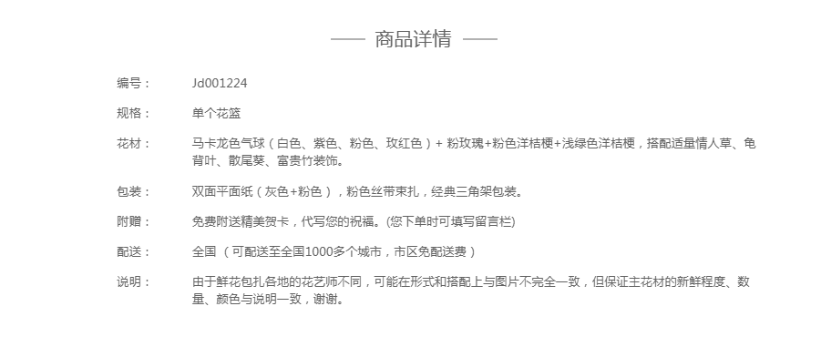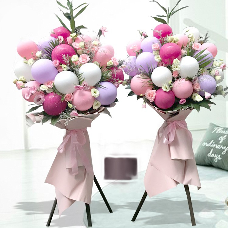花材:马卡龙色气球(白色、紫色、粉色、玫红色)+ 粉玫瑰+粉色洋桔梗+浅绿色洋桔梗,搭配适量情人草、龟背叶、散尾葵、富贵竹装饰