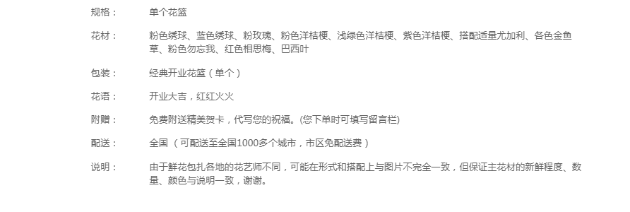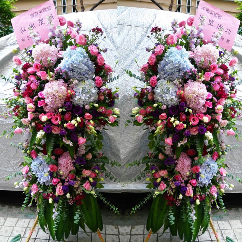 花材:粉色绣球、蓝色绣球、粉玫瑰、粉色洋桔梗、浅绿色洋桔梗、紫色洋桔梗、搭配适量尤加利、各色金鱼草、粉色勿忘我、红色相思梅、巴西叶