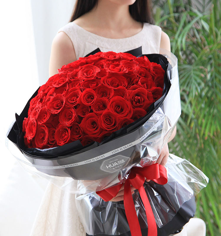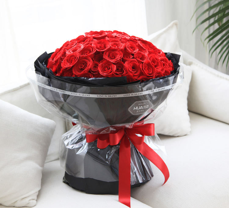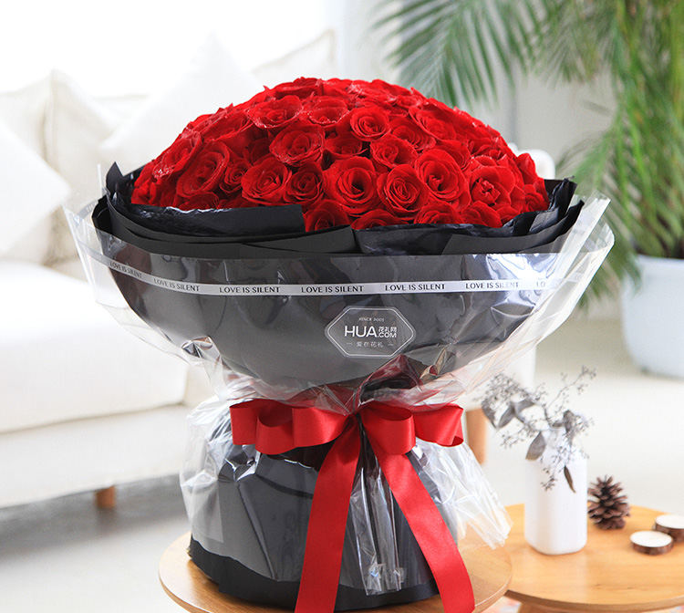 包 装:黑色雪梨纸,黑色条纹纸,玻璃纸卷,酒红色缎带花结