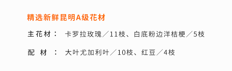 红色康乃馨11枝,粉色勿忘我3枝、尤加利10枝