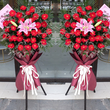 材料:红色非洲菊适量,粉色多头白色2枝,散尾叶、八角叶、情人草搭配