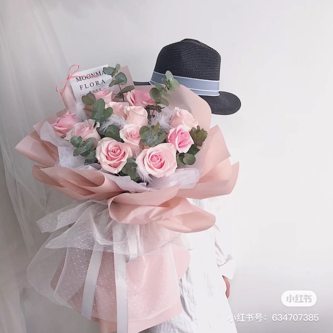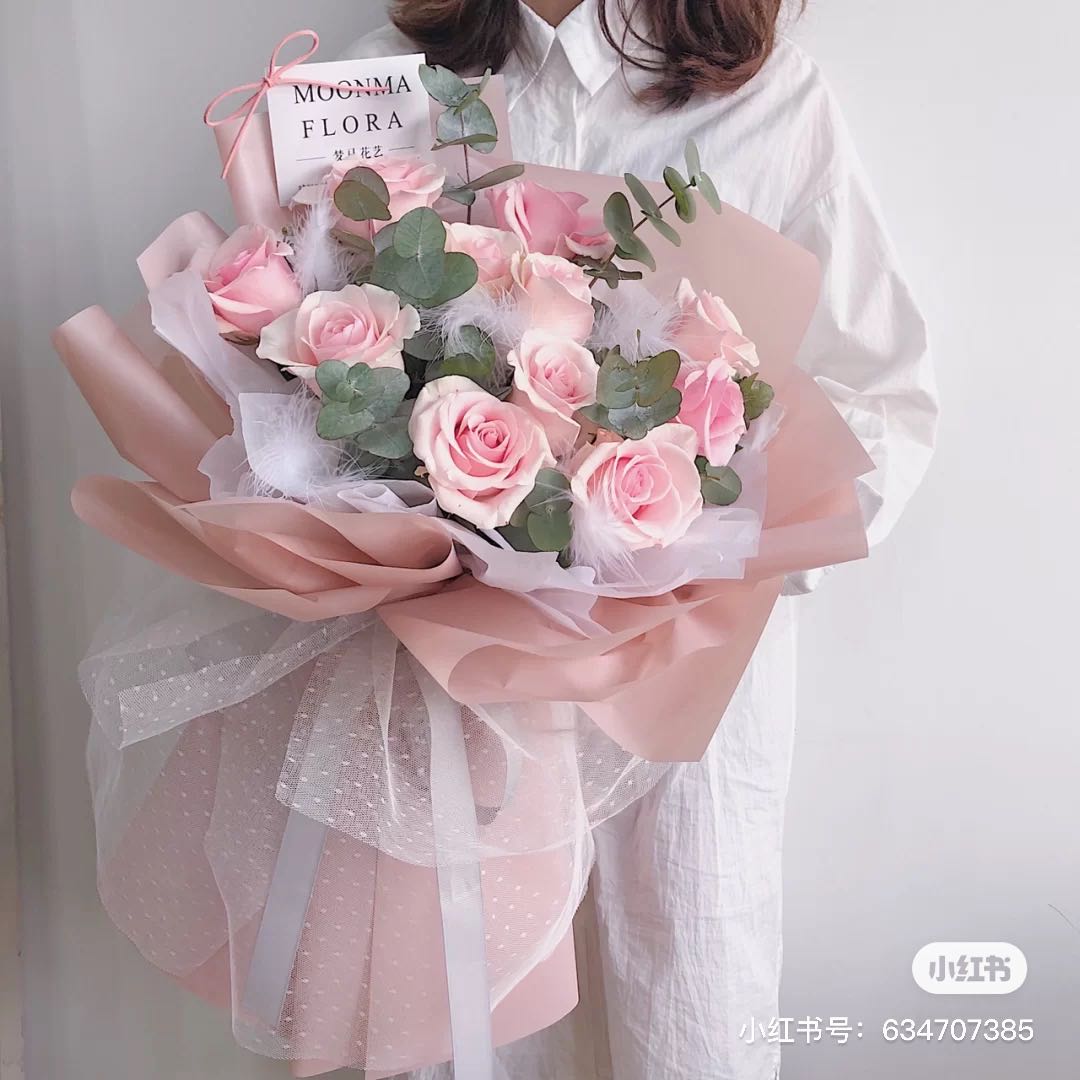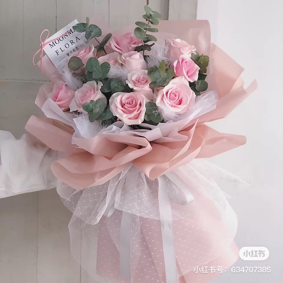 红色康乃馨11枝,粉色勿忘我3枝、尤加利10枝