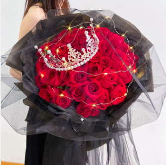 产品名称 : 皇冠恋人-33朵精品玫瑰搭配皇冠,黑色英文缎带搭配