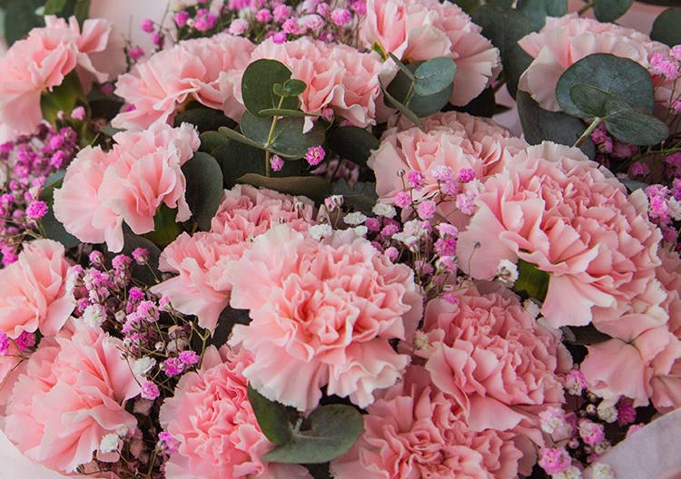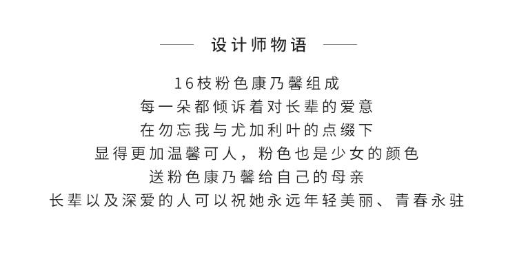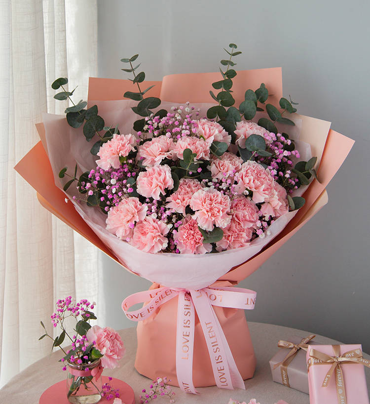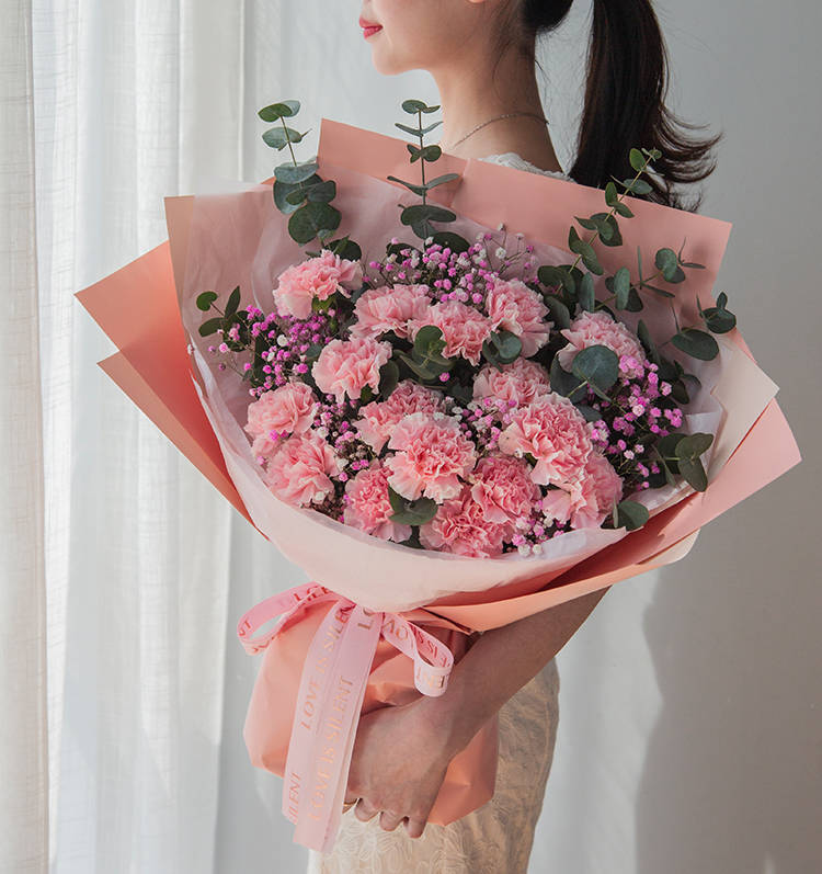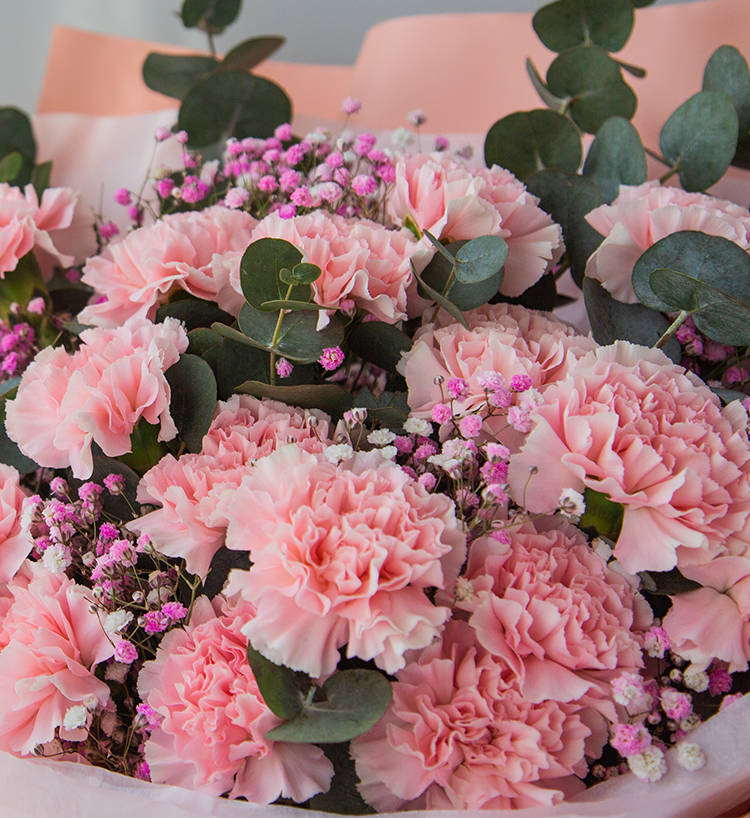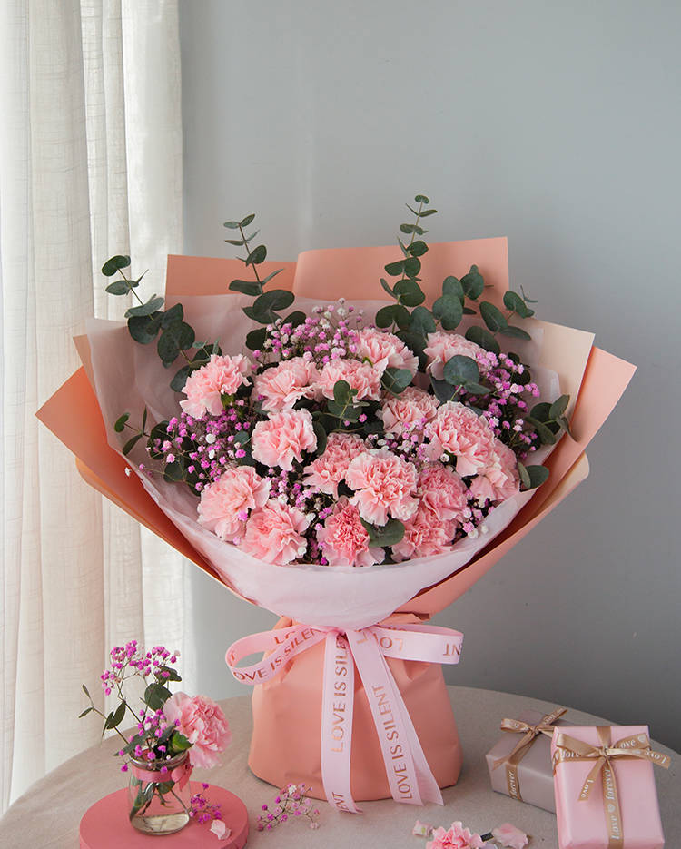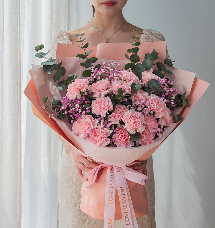 粉色康乃馨16枝、浅粉满天星3枝、尤加利10枝