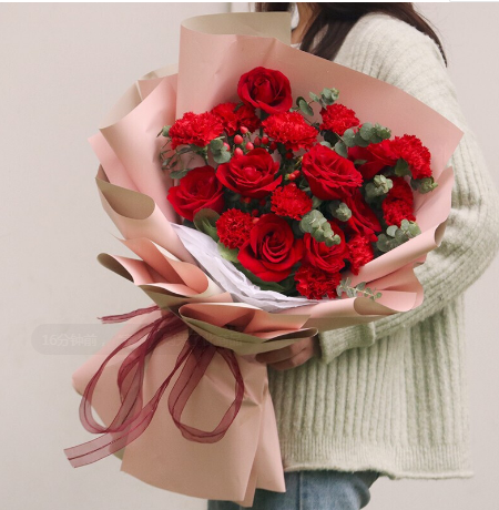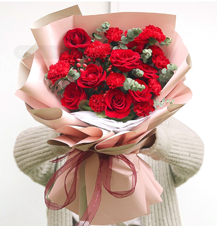红色康乃馨11枝,粉色勿忘我3枝、尤加利10枝