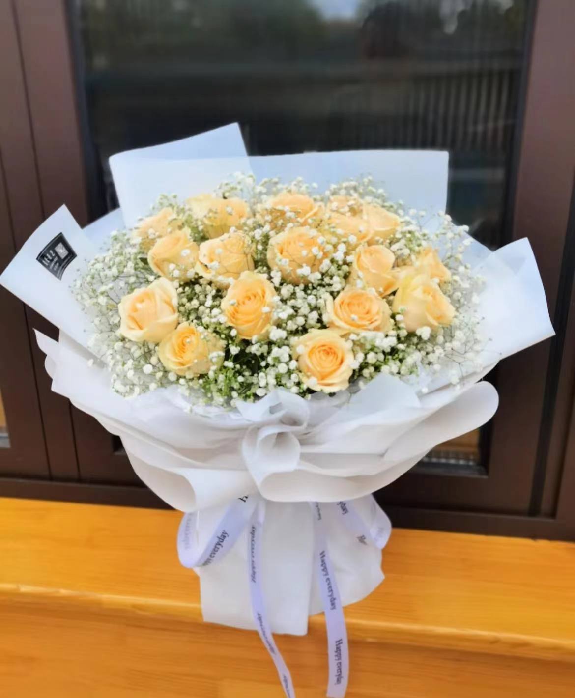 一路向阳-韩式花束系列:向日葵3枝、香槟玫瑰9枝、橙色多头玫...