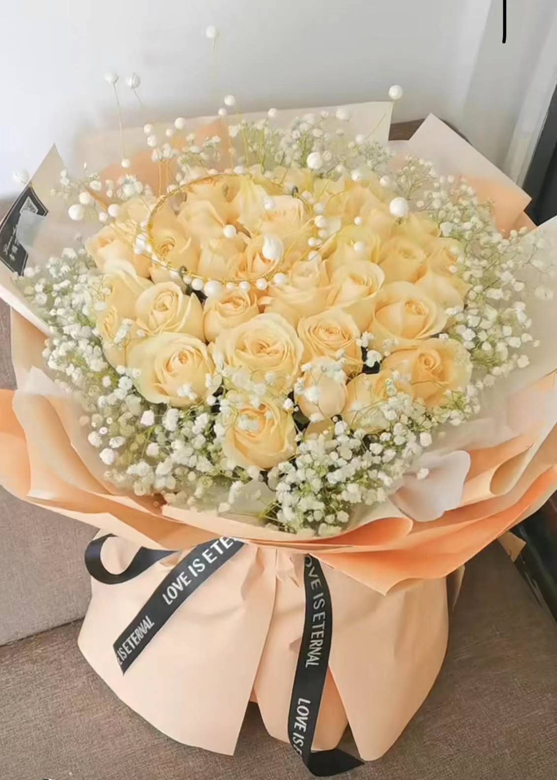 10朵红玫瑰,10朵香槟玫瑰,3支向日葵,尤加利栀子叶等绿叶丰满间插