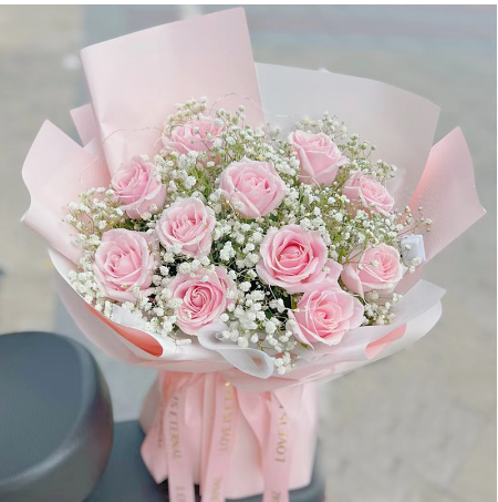 粉色心情-11朵粉雪山玫瑰.满天星