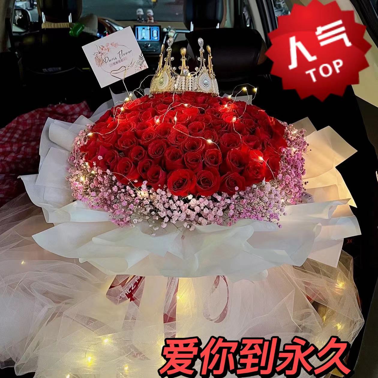 海枯石烂-99朵红玫瑰加满天星加彩灯