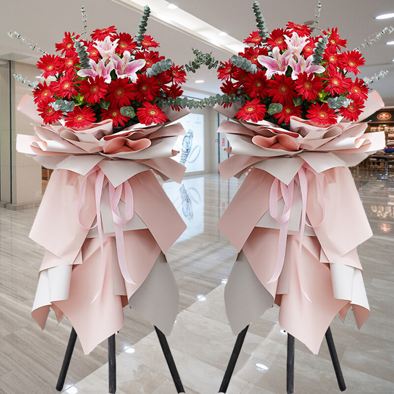 材料: 22朵红弗朗,3朵粉百合,尤加利等绿叶搭配。粉色欧雅纸束腰。 包装: 三脚架开业花篮