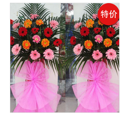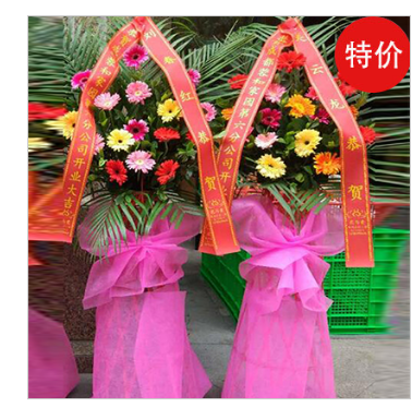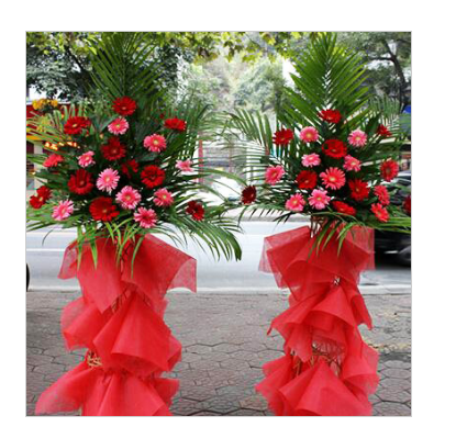 材料: 22朵红弗朗,3朵粉百合,尤加利等绿叶搭配。粉色欧雅纸束腰。 包装: 三脚架开业花篮