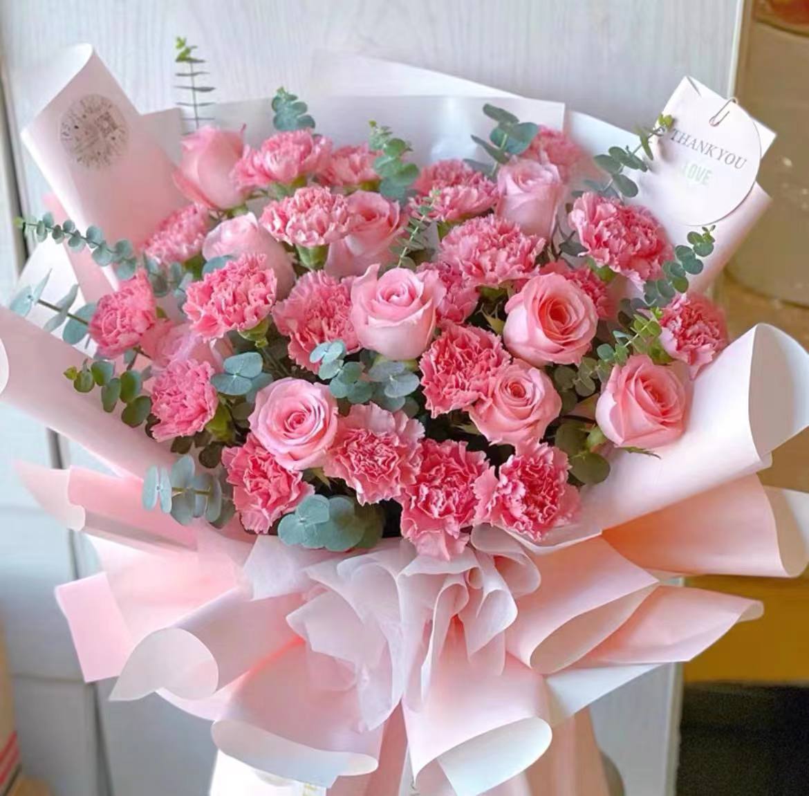 感恩有你-19朵粉康混搭花束尤加利