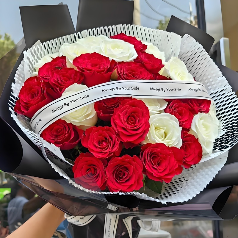 19朵红玫瑰,14朵白玫瑰,丝带搭配