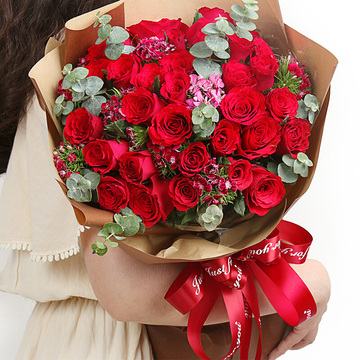 33支红玫瑰,红色石竹梅丰满间插,尤加利间插