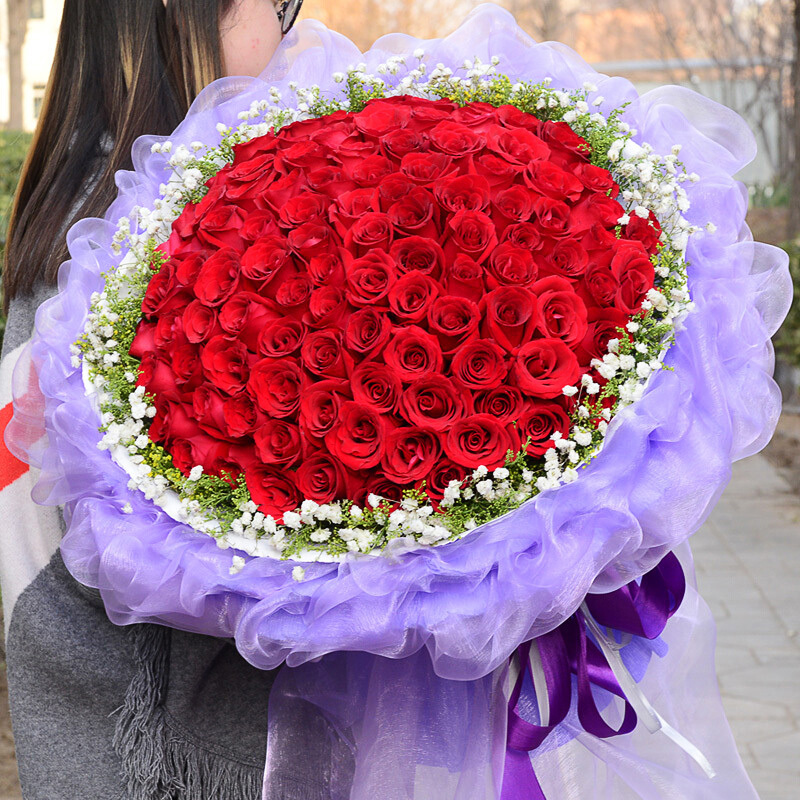 朵朵深情-99朵精品红玫瑰,外围白色满天星,黄莺丰满搭配