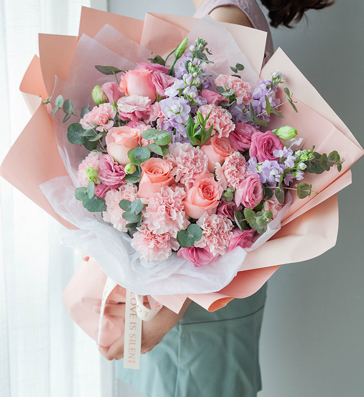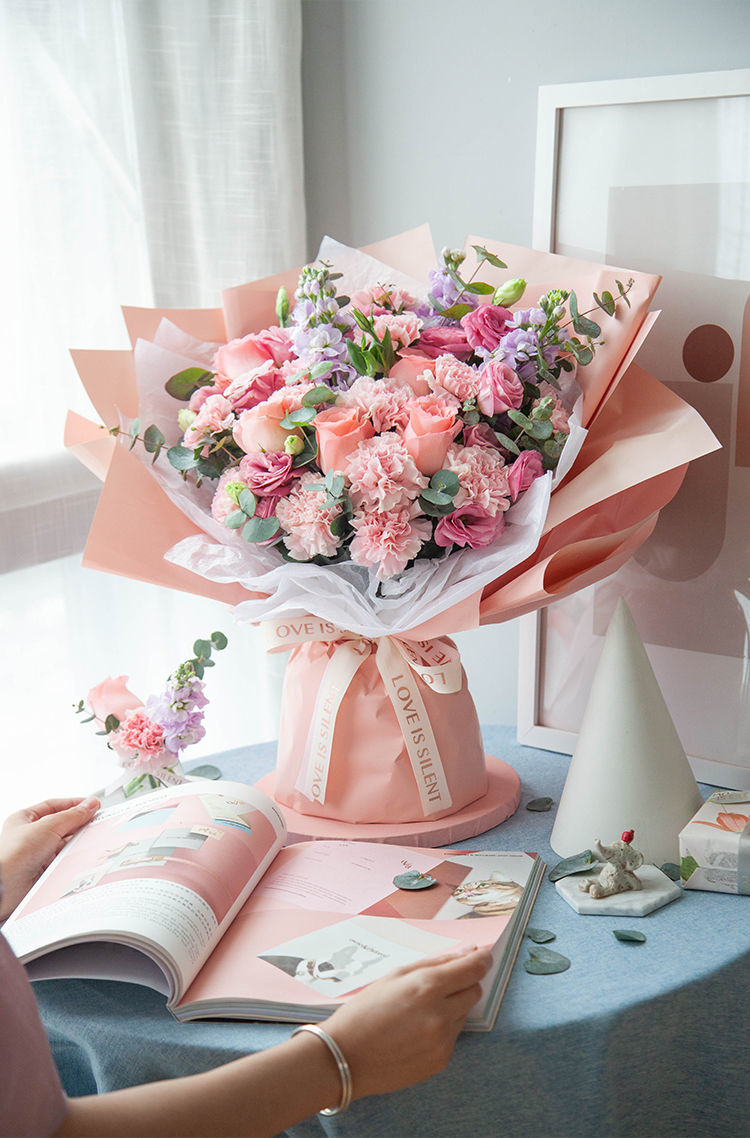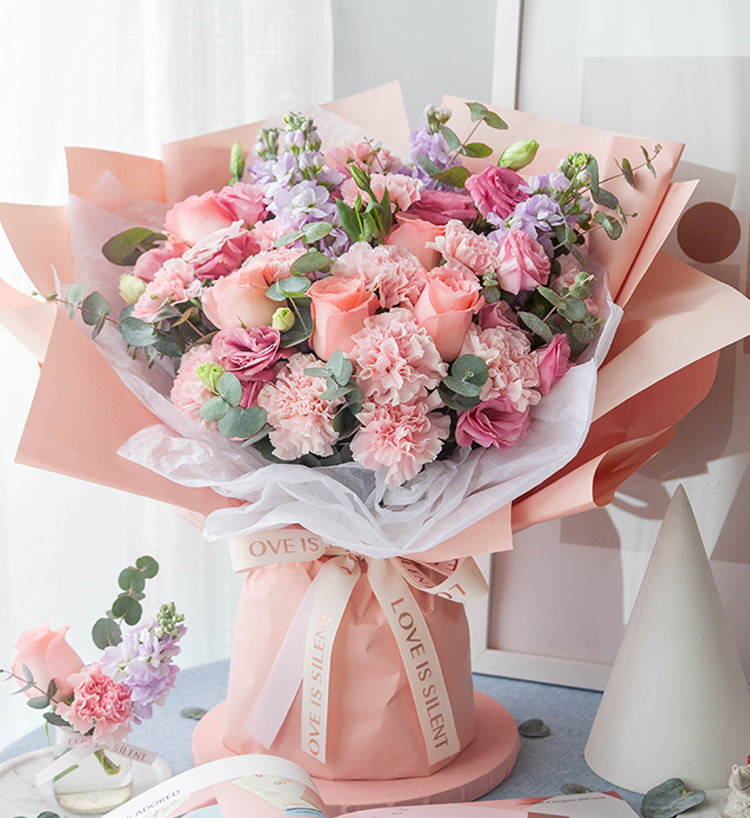 包 装:嫣粉/玫粉色欧雅纸8张、白色雪梨纸2大张、浅粉色罗纹玫瑰金丝带2米