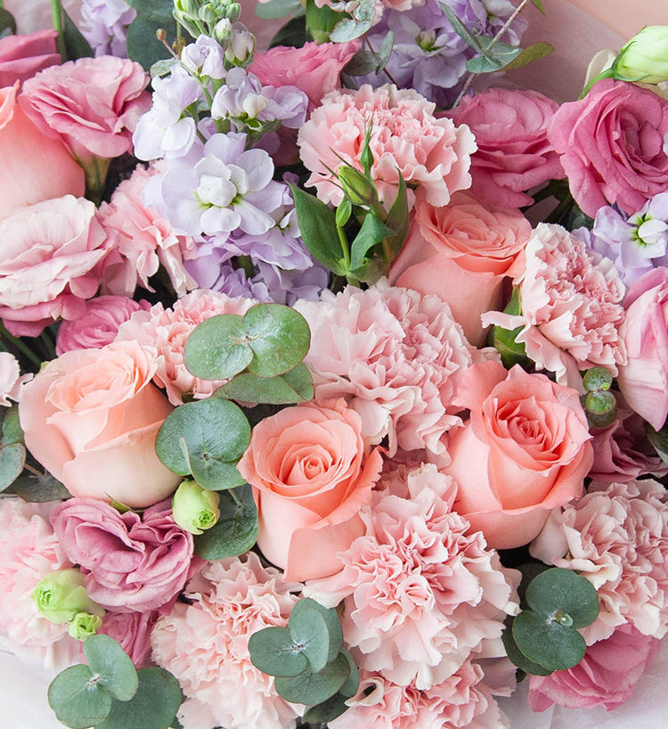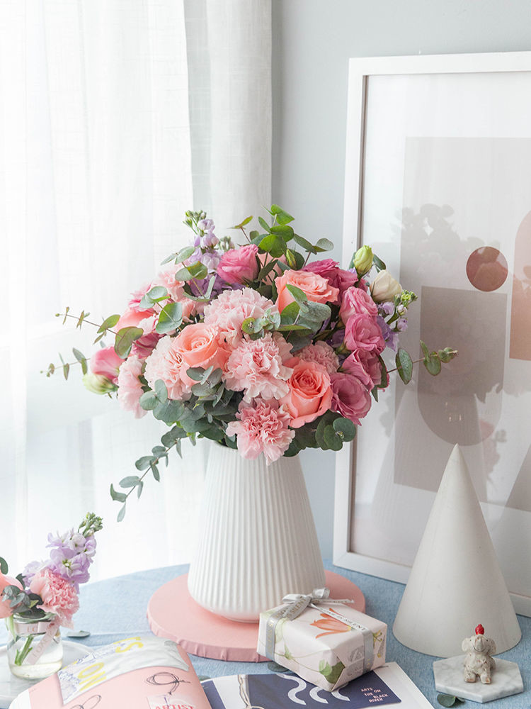 红色康乃馨11枝,粉色勿忘我3枝、尤加利10枝