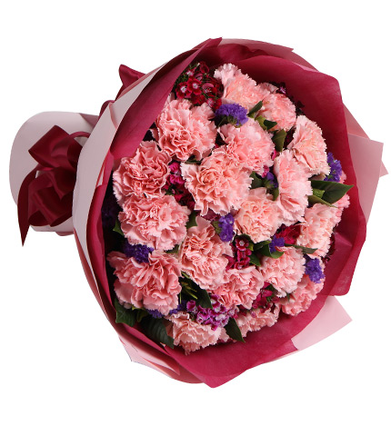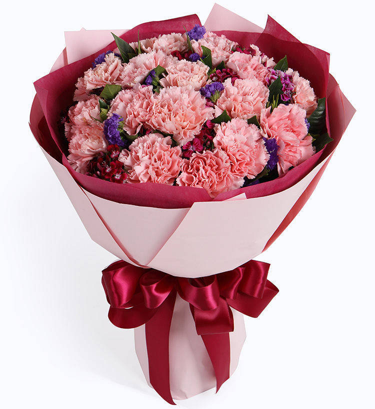 红色康乃馨11枝,粉色勿忘我3枝、尤加利10枝